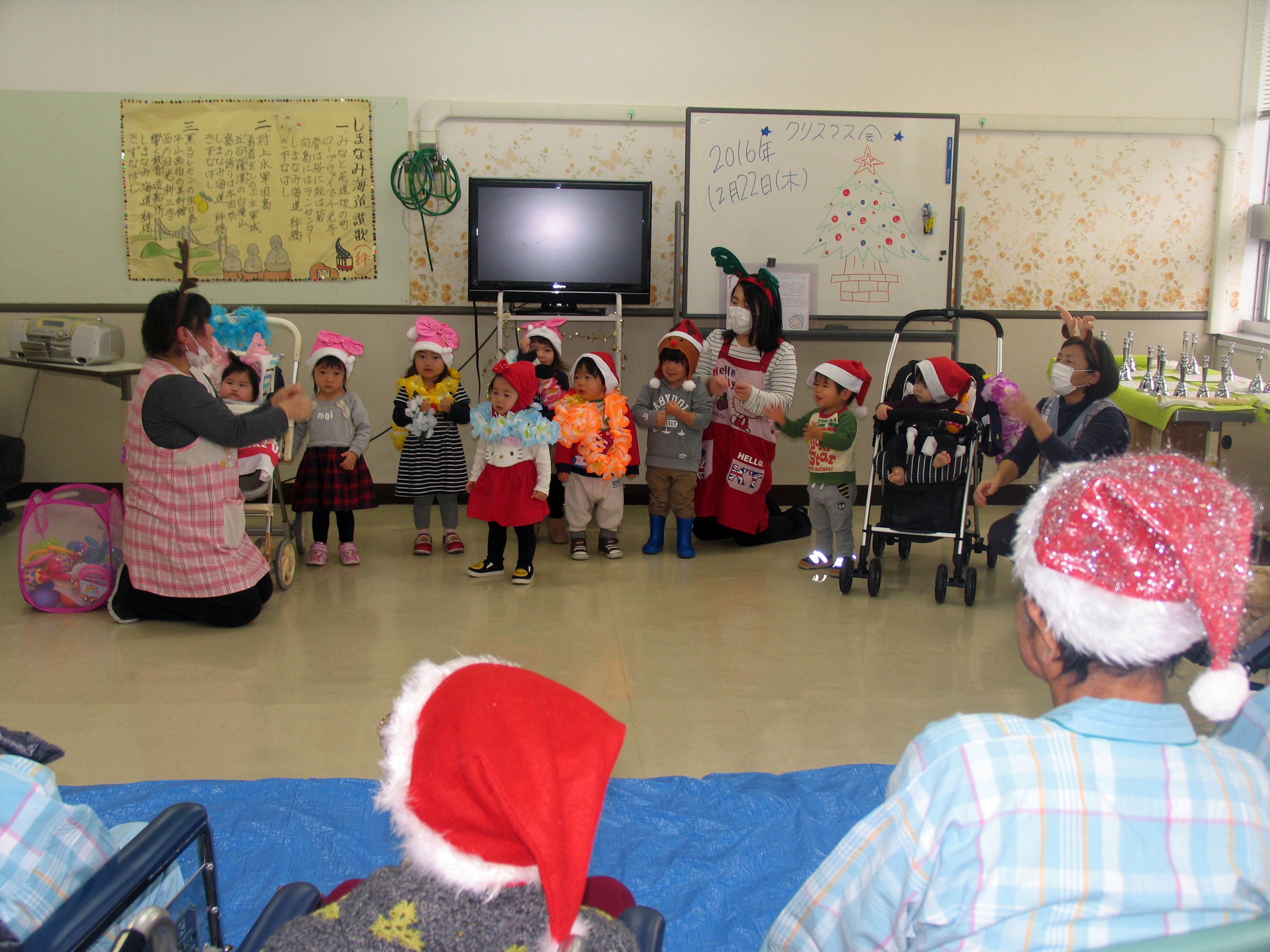 今回参加させてもらった託児所の子供達からはマラカスやスズを使った「あわてんぼうのサンタクロース」の演奏と、てあそび「ひげじいさん」を元気よく披露してくれました。